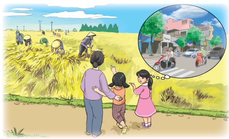 b) Bà dẫn Vân và Tâm đi xem gặt lúa.