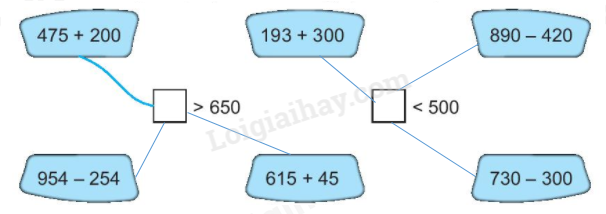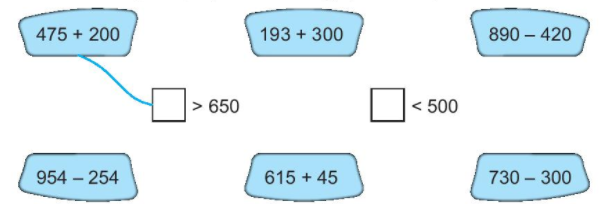 – Nối những phép tính có kết quả lớn hơn 650 và nhỏ hơn 500 cho thích hợp.
