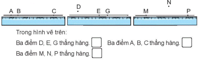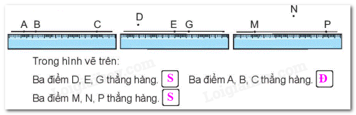 Quan sát hình vẽ, ba điểm thẳng hàng là ba điểm cùng nằm trên một đường thẳng hoặc một đoạn thẳng.