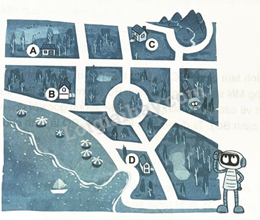 Biết Rô-bốt ở ngôi nhà như trong hình vẽ. Nhà của Mai và nhà của Rô-bốt ở hai đường song song với nhau. Hỏi đâu là nhà của Mai?