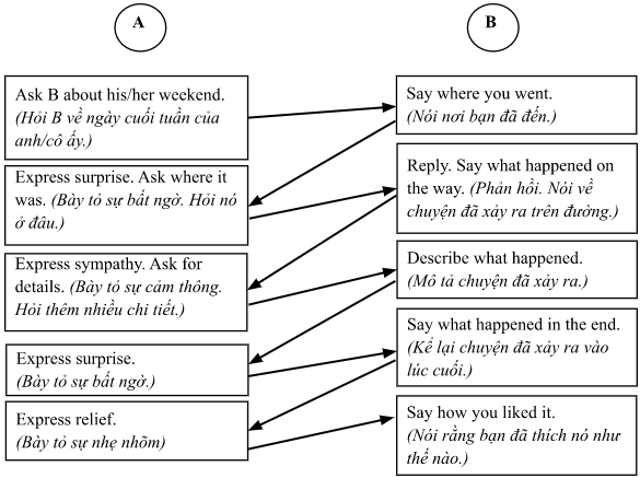 (Thực hiện một cuộc đối thoại tương tự như trong Bài tập 3 về ngày cuối tuần của bạn. Sử dụng các cụm từ trong hộp ngôn ngữ hữu ích. Làm theo sơ đồ. Chú ý đến ngữ điệu và nhịp điệu.)