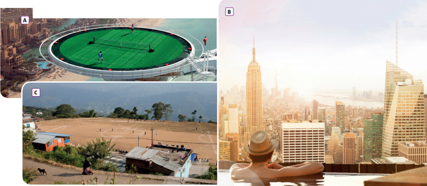(3 bức tranh đều nói về các hoạt động hoặc thể thao ở những địa điểm đẹp khác nhau. theo ý kiến của tôi, bức ảnh thứ hai là ngoạn mục nhất bởi vì tôi có thể nhìn thấy người đàn ông đang tận hưởng việc thư giãn trong bể bơi và ngắm nhìn một thành phố xinh đẹp từ đó.)