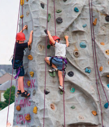 1. The photo shows two children on a climbing wall.
