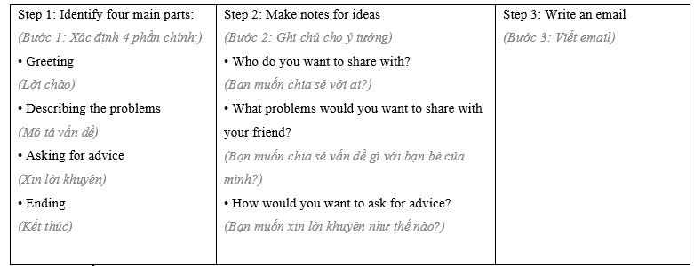 (Viết email cho người bạn thân nhất của bạn để chia sẻ với họ những vấn đề của bạn trong thời niên thiếu (ví dụ: bị bắt nạt, áp lực của cha mẹ, áp lực từ bạn bè, vấn đề gia đình, v.v.) và xin lời khuyên của họ, hãy làm theo các bước sau.)