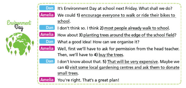 Amelia: Well, first we’ll have to ask for permission from the head teacher. Then, we’ll have to 4) buy the trees.