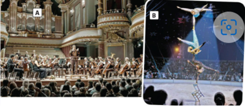 (Cả hai bức ảnh đều thể hiện các hình thức giải trí khác nhau: bức ảnh A mô tả một buổi hòa nhạc cổ điển, trong khi bức ảnh mô tả buổi biểu diễn xiếc.)