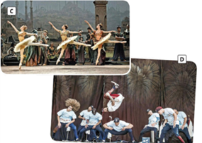Cả hai ảnh đều thể hiện các phong cách biểu diễn nhảy khác nhau: ảnh C chụp màn trình diễn múa ba lê, trong khi ảnh D chụp màn trình diễn hip hop.