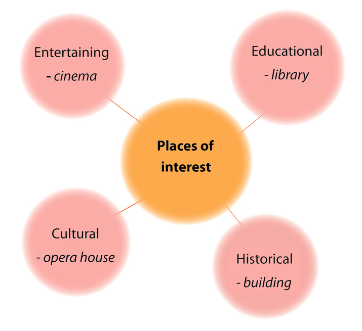 3. What are some places of interest in your area? Complete the word web. One word can belong to more than one category. Địa điểm tham qua ở chỗ bạn là gì? Hoàn thành sơ đồ sau. Một từ có thể thuộc nhiều hơn 1 mục