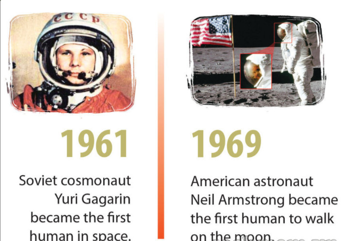 3. Gagarin had flown into space eight years before Armstrong walked on the moon.