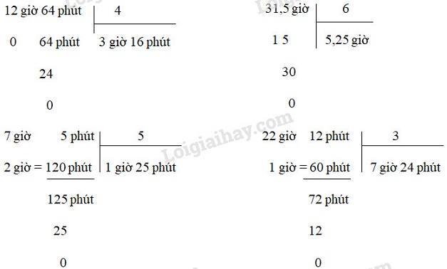 12 giờ 64 phút : 4                                    31,5 giờ : 6