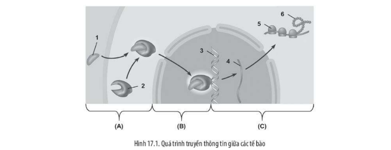 Sơ đồ sau đây mô tả cho quá trình truyền thông tin giữa các tế bào. Hãy chú thích các thành phần được đánh số từ 1 đến 6. Nêu tên các giai đoạn (A), (B), (C) và trình bày cơ chế của mỗi giai đoạn đó.