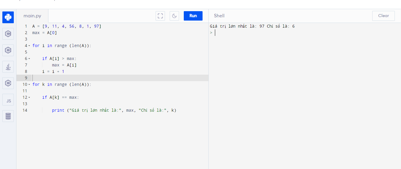 Chương trình tính giá trị và chỉ số của phần tử lớn nhất của A