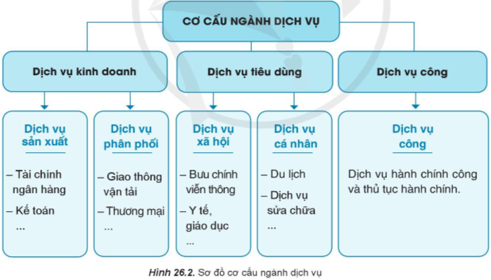 – Đọc thông tin trong mục “Cơ cấu ngành dịch vụ” và quan sát hình 26.2.