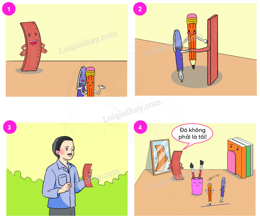 Thước kẻ soi mình trong gương thì thấy một chiếc thước kẻ mặt mày vênh váo, cái ngực cứ ưỡn mãi lên. Nó tức giận nói với bút mực và bút chì rằng: