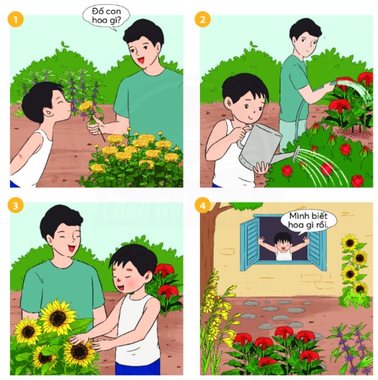 – Tranh 3: Bạn nhỏ dùng tay sờ hoa để đoán tên loài hoa.