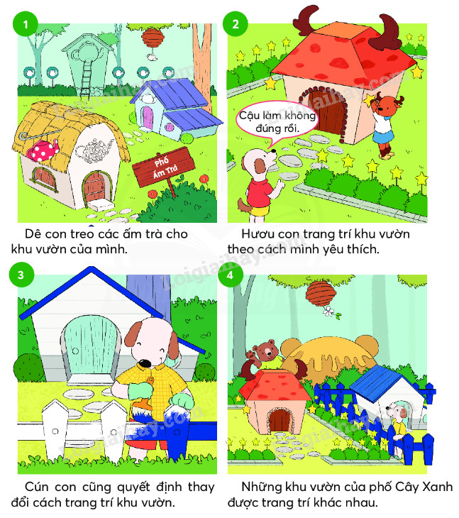 4. Mọi người nhìn thấy hươu con và cún con làm liền thích thú về trang trí lại khu vườn theo sở thích của mình. Bây giờ, phố Cây Xanh có nhiều ngôi nhà có những khu vườn được trang trí khác nhau.