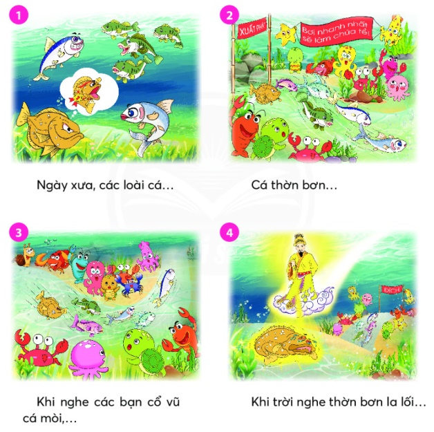 * Tranh 1: Ngày xưa, các loài cá sống cùng với nhau nhưng lại không chơi với nhau. Chúng không những không đoàn kết mà còn thường xuyên xảy ra xích mích. Những con cá lớn thường ỷ mạnh và khỏe để bắt nạt những con cá yếu ớt. Để thay đổi tình hình hiện tại, họ nhà cá đã họp nhau tổ chức cuộc thi bơi để chọn ra chú cá bơi nhanh nhất sẽ trở thành chúa tể. Với hy vọng mỗi khi họ nhà cá có ai bị bắt nạt, chúa tể sẽ bơi tới thật nhanh để giúp đỡ.