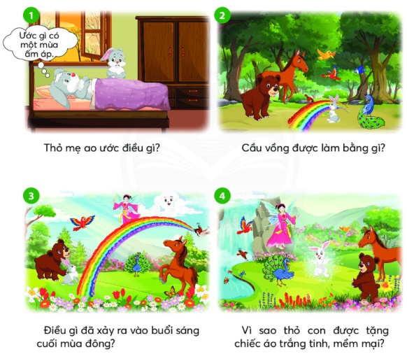 2. Thỏ con nghe nói mùa ấm áp đó là mùa xuân. Nhưng mùa xuân chỉ đến khi có cầu vồng cùng muôn hoa chào đón. Thương mẹ, nó bàn với bác gấu: