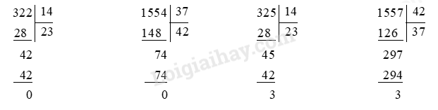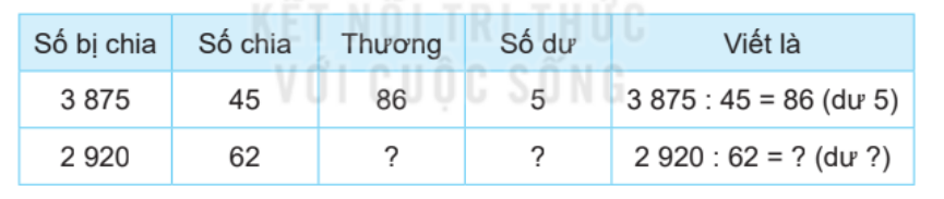 Thực hiện phép chia rồi ghi thương và số dư vào trong bảng.