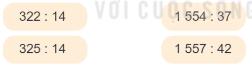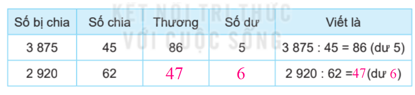 Thực hiện phép chia rồi ghi thương và số dư vào trong bảng.