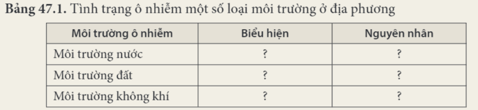 1. Điều tra về tình trạng ô nhiễm môi trường ở địa phương, nêu các biểu hiện và tìm hiểu nguyên nhân gây tình trạng đó rồi hoàn thành thông tin theo mẫu bảng 47.1.