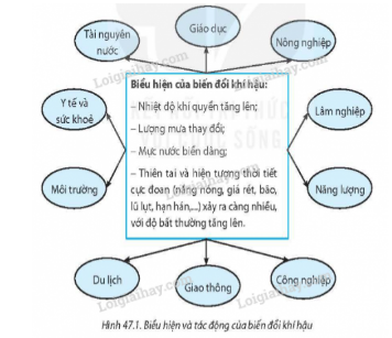 a) Từ các biểu hiện chủ yếu của biến đổi khí hậu, hãy nêu tác động của nó đối với một số ngành và lĩnh vực chính (Hình 47.1).
