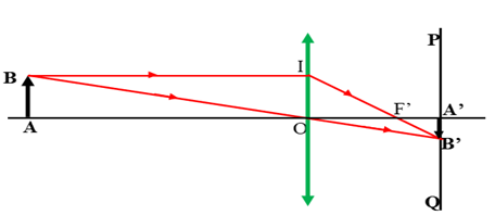 – Từ B kẻ tia tới BI song song với trục chính cho tia ló IB’. Tia ló này cắt trục chính tại tiêu điểm F’.