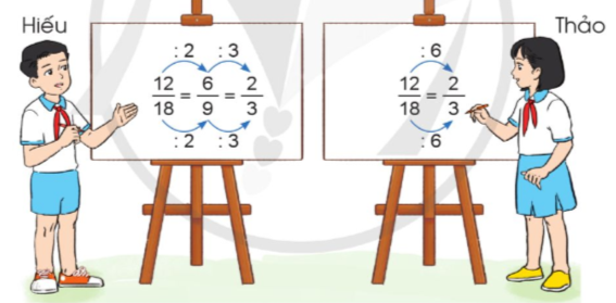 a) Quan sát cách tính của Hiếu và Thảo khi rút gọn phân số $\frac{{12}}{{18}}$ rồi nêu nhận xét:
