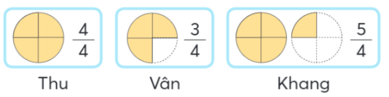 a) So sánh phần bánh mỗi bạn ăn với một cái bánh (nhiều hơn, ít hơn hay bằng)