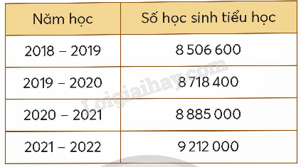 Dưới đây là bảng thống kê số học sinh tiểu học trên cả nước trong bốn năm học (từ năm học 2018 – 2019 đến năm học 2021 – 2022).