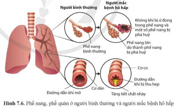 Dựa vào hình 7.6 và so sánh cấu tạo đường hô hấp của người bình thường và người mắc bệnh hô hấp.