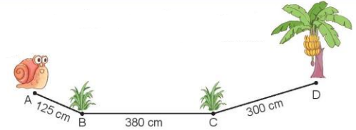 Con ốc sên bò đến cây chuối theo đường gấp khúc ABCD. Tính độ dài quãng đường ốc sên phải bò?