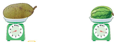 Quan sát tranh để tìm cân nặng của quả mít và quả dưa hấu.