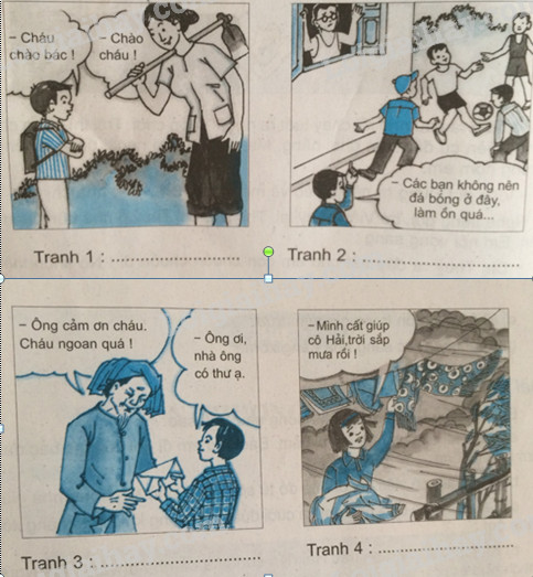 – Tranh 1: Chào hỏi người lớn tuổi.