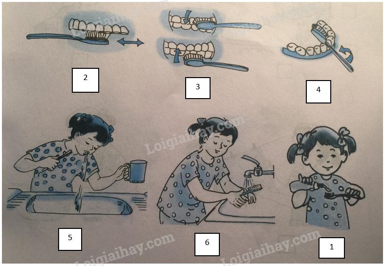 Hoạt động quan sát và trả lời: Hãy viết số thứ tự (1,2,3,4,5,6) vào mỗi hình cho phù hợp với 6 bước cần thực hiện khi đánh răng: