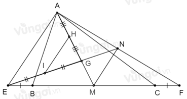 Cho \(\Delta ABC.\) Trên tia đối của tia \(BC\) lấy điểm \(E,\) trên tia đối của tia \(CB\) lấy điểm \(F\) sao cho \(BE = CF.\) Gọi \(G\) là trọng tâm tam giác \(ABC.\)\(AG\) cắt \(BC\) tại \(M\). Lấy \(H\) là trung điểm \(AG.\) Nối \(EG\) cắt \(AF\) tại \(N.\) Lấy \(I\) là trung điểm \(EG.\)