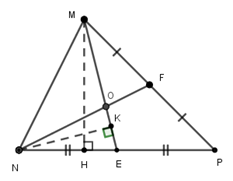 Hai đường trung tuyến $ME$  và $NF$  cắt nhau tại $O$  nên $O$  là trọng tâm tam giác $MNP,$  do đó \(MO = \dfrac{2}{3}ME\).