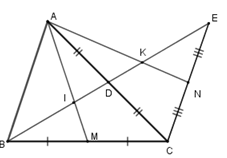 Cho tam giác \(ABC\), đường trung tuyến \(BD\). Trên tia đối của tia $DB$ lấy điểm \(E\) sao cho \(DE = DB.\) Gọi \(M,N\) theo thứ tự là trung điểm của \(BC;CE.\) Gọi \(I;K\) theo thứ tự là giao điểm của \(AM,AN\) với \(BE.\)  Chọn câu đúng.