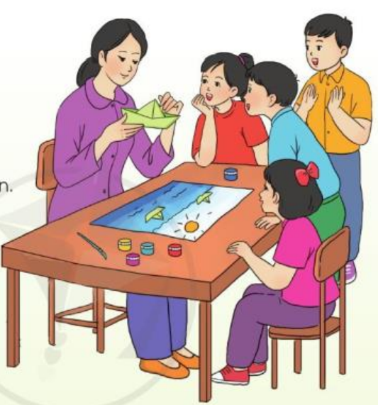 Cô giáo đã dạy các bạn nhỏ môn gì? Em hãy miêu tả bức tranh mà cô giáo tạo nên từ những tờ giấy màu. Tìm những từ ngữ cho thấy cô giáo rất khéo tay. Hãy nêu cảm nghĩ của em về đôi bàn tay của cô giáo.