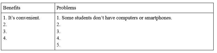 (Làm việc nhóm. Nói về một nền tảng bạn sử dụng cho trực tuyến của bạn các lớp học hoặc một trong những bạn biết về. Những lợi ích là gì và vấn đề của việc sử dụng nó?)