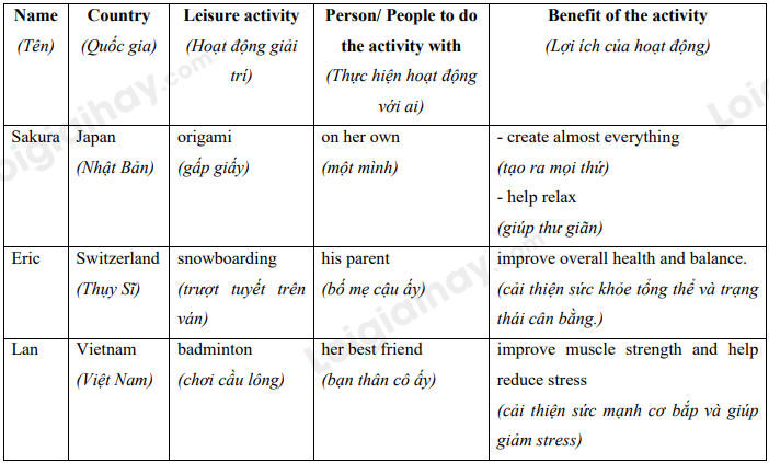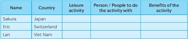 (Đọc những gì ba thanh thiếu niên nói về hoạt động giải trí của họ. Hoàn thành bảng với các thông tin từ văn bản.)