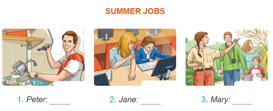 1. Listen to Peter, Jane, and Mary talking about their summer jobs. What does each person do? Write his/her job under each picture.