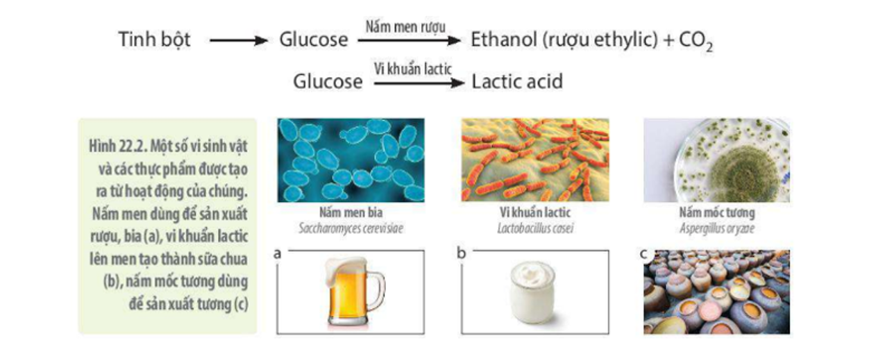 Bánh mì, bia, rượu đều là sản phẩm lên men của nấm Saccharomyces cerevisiae qua quá trình lên men. Sữa chua, phomai là sản phẩm lên men của vi khuẩn lactic.