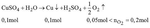 \( \to \) Nước bị điện phân. Lượng \(Cu \downarrow \) đã đạt cực đại: \(0,1mol \leftrightarrow 6,4gam.\)