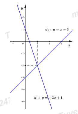 Cho đường thẳng \(\left( {{d_1}} \right):y =  – 3x + 1\) và đường thẳng \(\left( {{d_2}} \right):y = x – 3\).