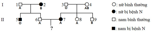 Câu 40: Một bệnh di truyền (N) ở người do một alen của một gen có 2 alen trội lặn hoàn toàn quy định. Gen này liên kết với 1 gen mã hóa nhóm máu hệ ABO (gen quy định nhóm máu có 3 alen IA, IB, IO, trong đó alen IA quy định nhóm A, alen IB quy định nhóm B, alen IO quy định nhóm máu O; alen IA và alen IB đồng trội hoàn toàn so với alen IO). Khoảng cách giữa gen quy định bệnh (N) với gen quy định nhóm máu là 6 cM. Sự di truyền của hai tính trạng nói trên được biểu diễn theo sơ đồ sau: