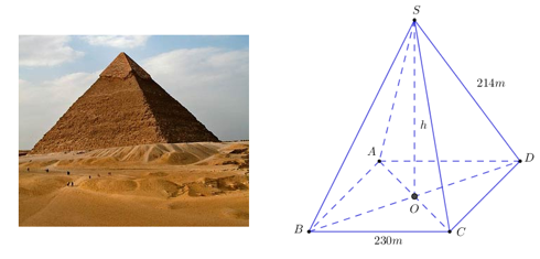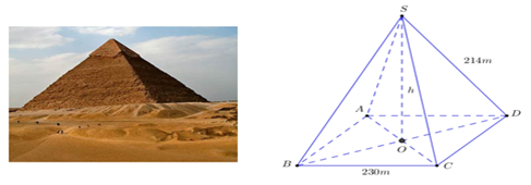 Bài 4: (0,75 điểm)Kim tự tháp Kheops – Ai Cập có dạng hình chóp đều, đáy là hình vuông, các mặt bên là các tam giác cân chung đỉnh (hình vẽ). Mỗi cạnh bên của kim tự tháp dài 214 m, cạnh đáy của nó dài 230 m.