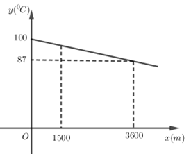 Bài 6 (1 điểm). Nhiệt độ sôi của nước không phải lúc nào cũng là \({100^0}C\) mà phụ thuộc vào độ cao của nơi đó so với mực nước biển. Chẳng hạn Thành phố Hồ Chí Minh có độ cao xem như ngang mực nước biển \(\left( {x = 0\,m} \right)\) thì nước có nhiệt độ sôi là \(y = {100^0}C\) nhưng ở thủ đô La Paz của Bolivia, Nam Mỹ có độ cao \(x = 3\,600\,m\) so với mực nước biển thì nhiệt độ sôi của nước là \(y = {87^0}C\). Ở độ cao trong khoảng vài \(km\), người ta thấy mối liên hệ giữa hai đại lượng này là một hàm số bậc nhất \(y = ax + b\) có đồ thị như sau: