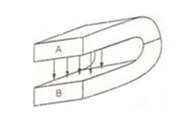 Cực Bắc tại A, cực Nam tại B và từ trường đều ở giữa hai nhánh nam châm.