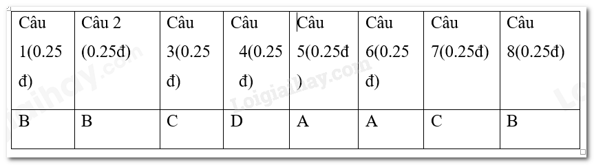 Khoanh tròn vào chữ cái đứng trước phương án trả lời đúng cho các câu hỏi từ 1 đến 8: